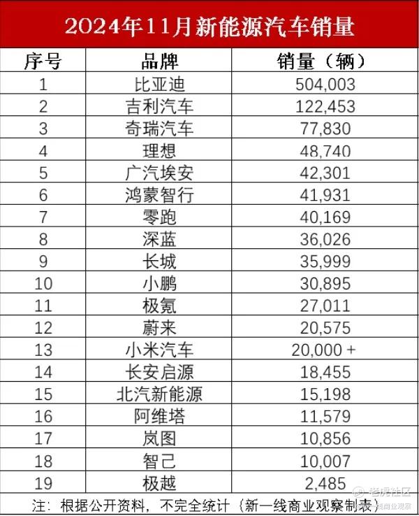 昨日,各大新能源车企相继上交11月交付成绩单,根据公开数据,新一线商业观察整理了一份11月新能源汽车销量排名表。