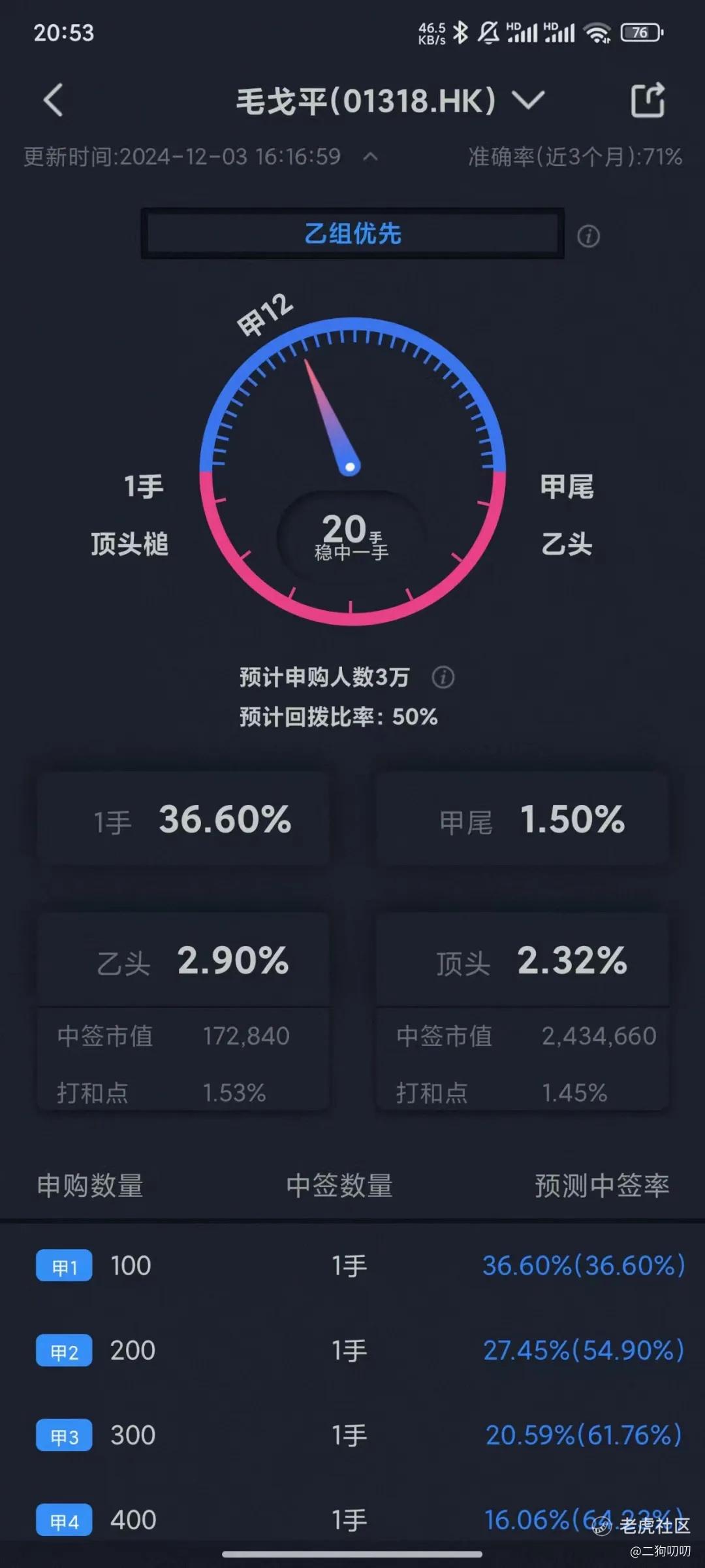 香港公开发售705.89万股,每手100股,合计70589手,目前孖展已经超过了200倍,还真的是火爆,预计回拨至50%,那么甲乙组各获17.6万手,按照3w人申购,预计1手中签率在30%-50%。。。