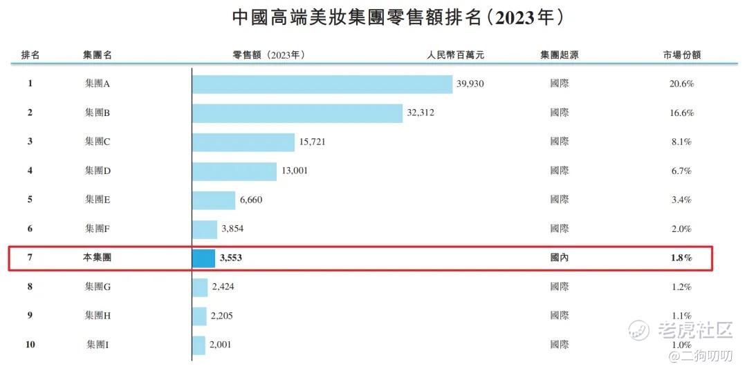 根据弗若斯特沙利文的资料,公司是中国市场十大高端美妆集团中唯一的中国公司,这个确实很厉害!