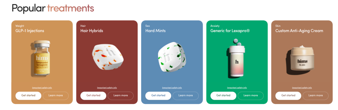而且,HIMS的亮点还在于它的个性化治疗方案。每个患者的剂量、药物的组合,甚至是成分,都会根据个人需求量身定制。传统药房的标准药物配方往往无法提供合适的剂量、形式,甚至可能包含患者过敏的成分。而HIMS通过这种个性化的方式,让客户觉得自己的“健康方案”比传统医疗保健系统的更好,因而吸引了大量忠实订阅用户。