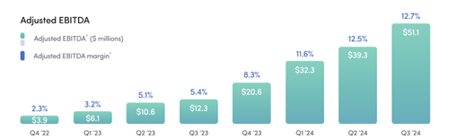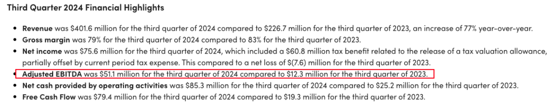 更让人印象深刻的是利润表现。HIMS的经调整EBITDA达到了5110万美元,同比增长接近400%,利润率提升至13%。