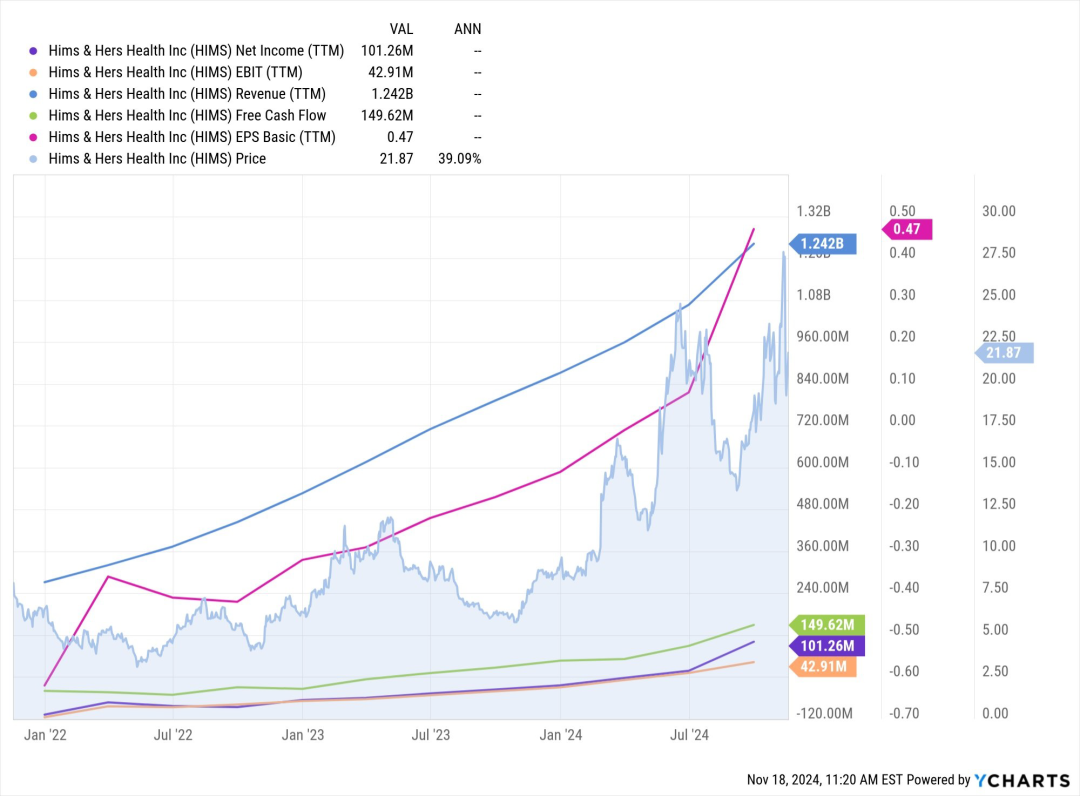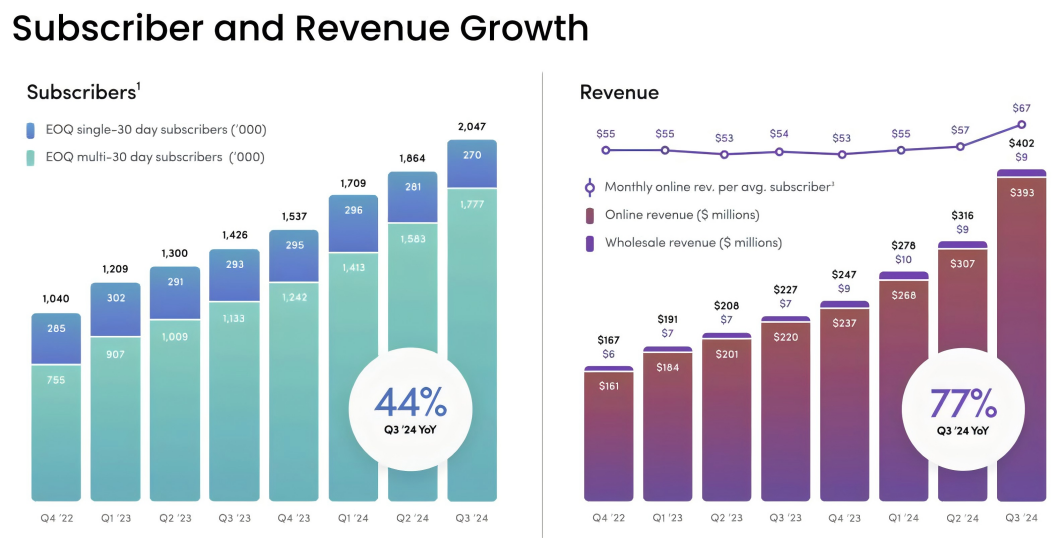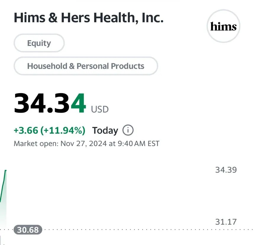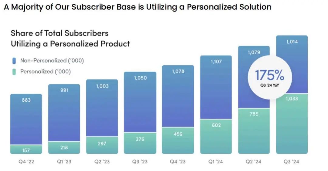 HIMS的个性化健康产品在第三季度的订阅用户同比增长了175%,这些用户已占总订阅用户的50%以上。这一数据突出了HIMS在个性化远程医疗领域的独特优势,尤其是在年轻消费者中,越来越多的人开始寻求定制化健康方案。