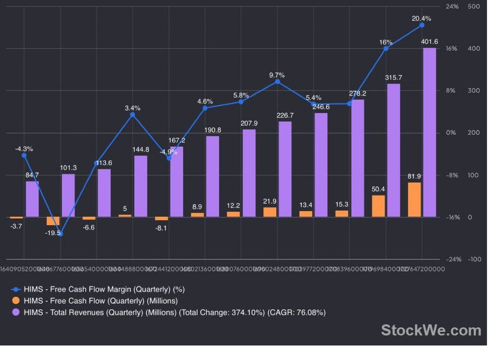 首先,从收入方面来看,HIMS在第三季度实现了4.016亿美元的营收,同比增长了77%。更为引人注目的是,这一增速显示出明显加快的趋势:第一季度增长46%,第二季度增长52%,而第三季度则进一步加速(77%)。这不仅反映了公司业务的快速扩张,也体现了其在执行和市场适应上的持续优化。