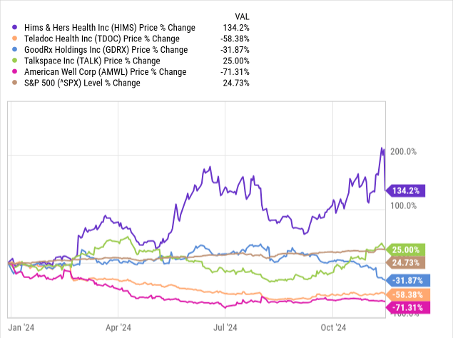 这张图展示了HIMS的股价涨幅远超其他几家远程医疗公司,甚至大幅超过了标普500指数。