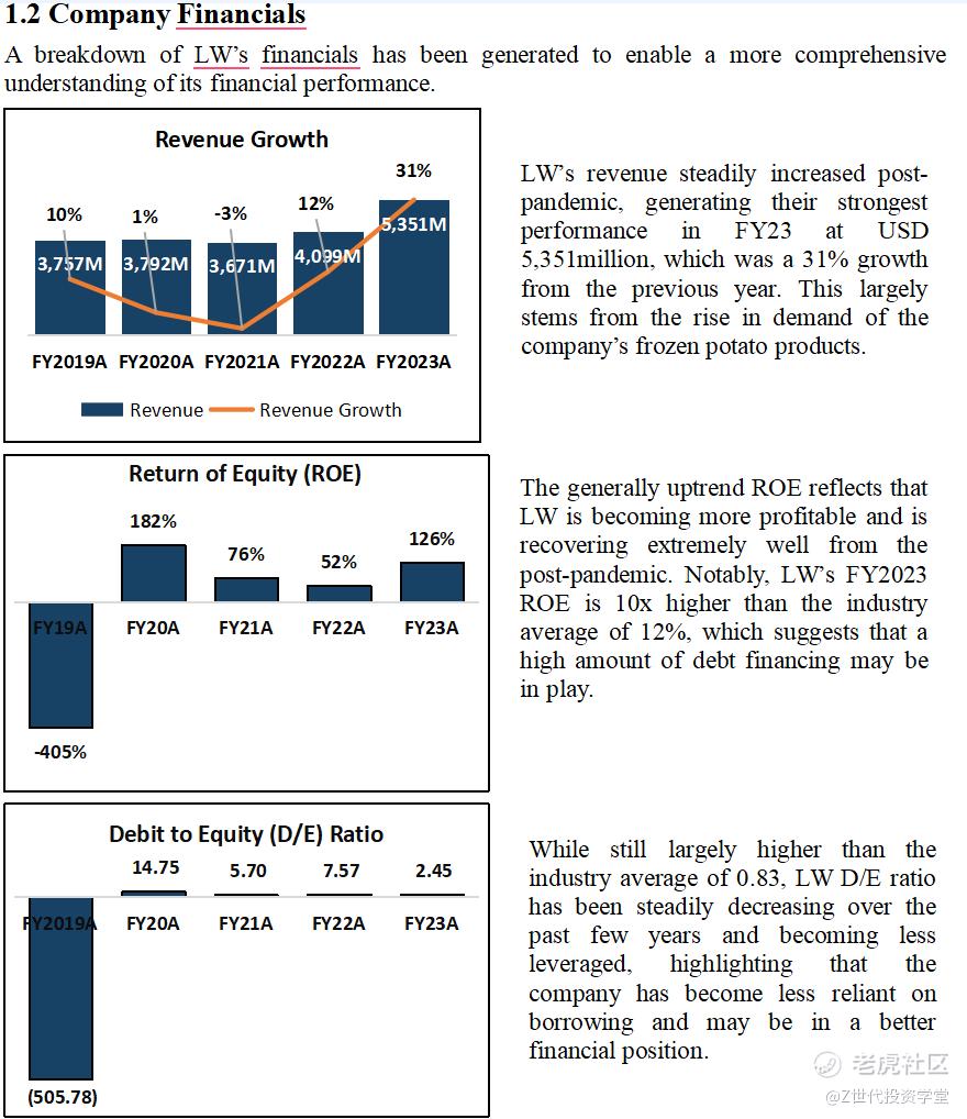 Overall, LW's financial performance appears to be very positive. It is experiencing strong revenue growth and improving profitability, and managing its debt effectively. However, there might be room for further improvement in capital efficiency to maximize returns for shareholders.