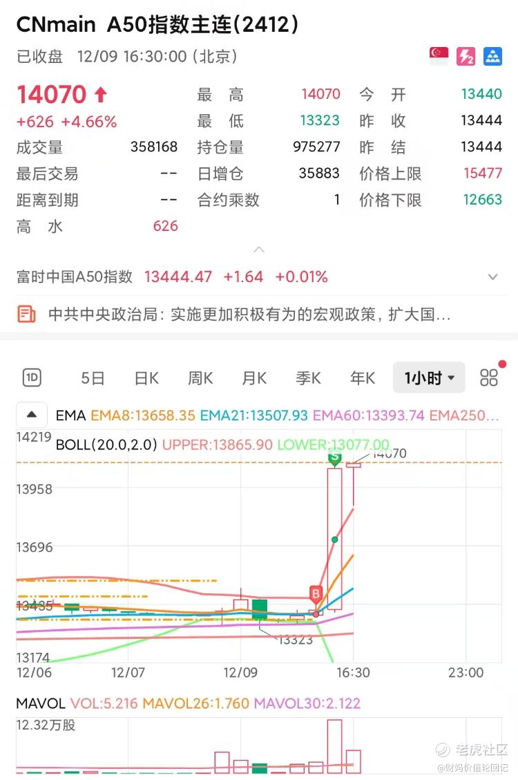 正好财妈下午开盘后按符合波段策略的信号,布局了 $A50指数主连(2412) (CNmain.SG)$ 的多单,虽然当时不知是政策出来了,没有格局卖飞了,