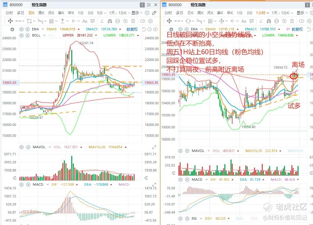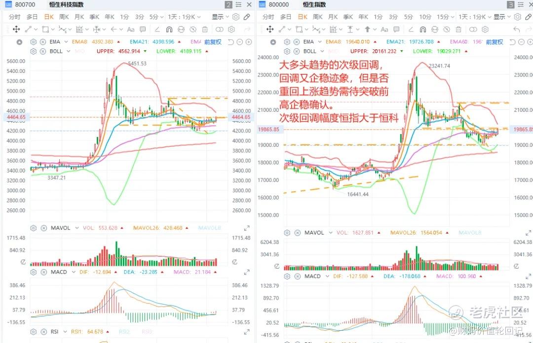 从截图可看出,A50与恒生科技指数日线图整体仍处于大上涨趋势的次级回调中,回调近50%的位置向下假突破前低后重回大震荡区间。
