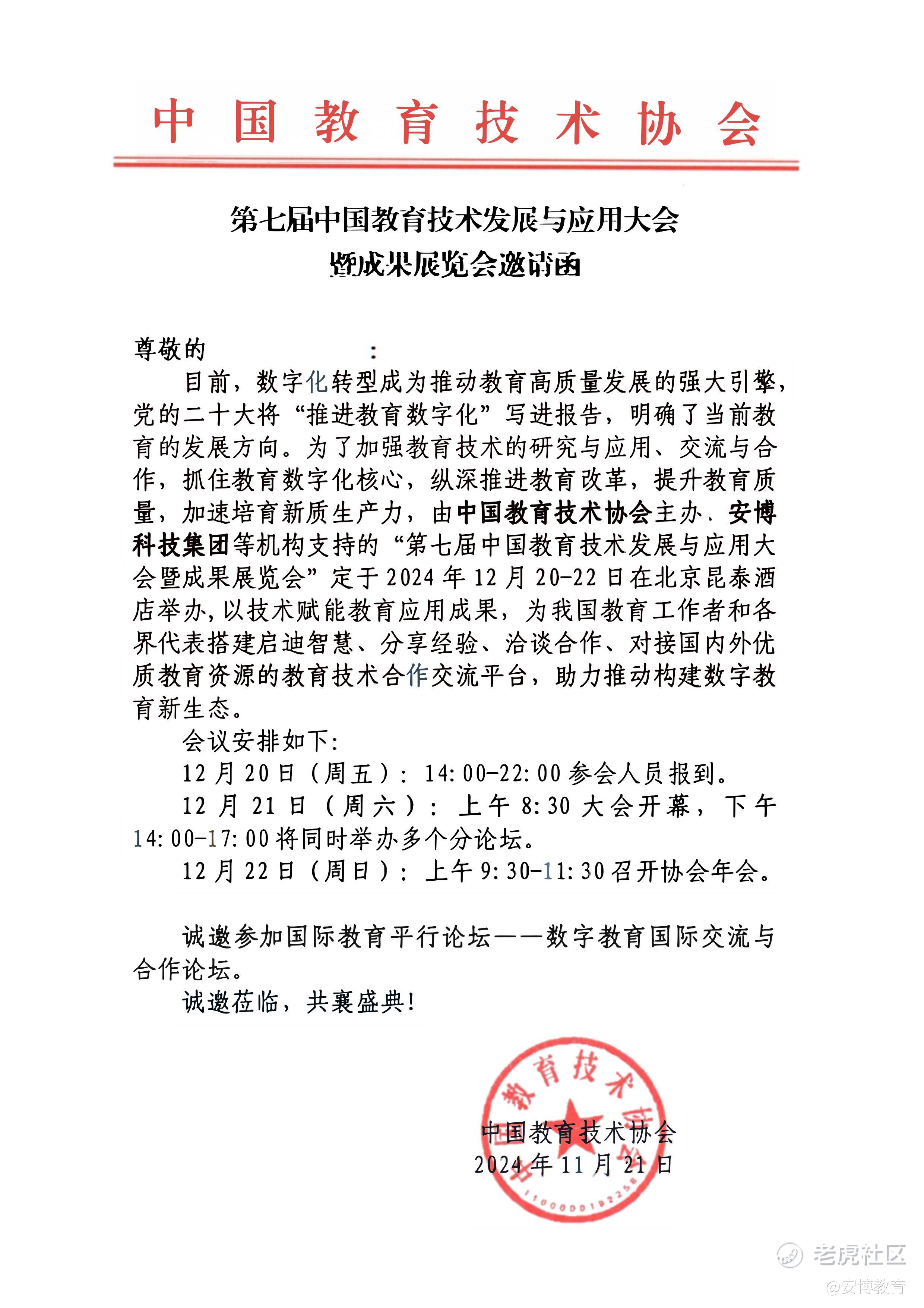 由中国教育技术协会主办,安博科技集团等机构特别支持的第七届中国教育技术发展与应用大会暨成果展览会定于12月21-22日在北京盛大召开。此次盛会汇聚了教育部领导、相关行业协会领导、中国工程院院士、企业代表等专家学者。会议重点探讨中国教育数字化转型及其国际化发展趋势、从传统到人工智能时代的发展与教育变革、教育数字化进程中的重大命题、AIGC在教育领域的应用现状与未来趋势分析、教育大数据重塑教育未来等主题。大会设置主论坛与十一个平行论坛,内容丰富多元。