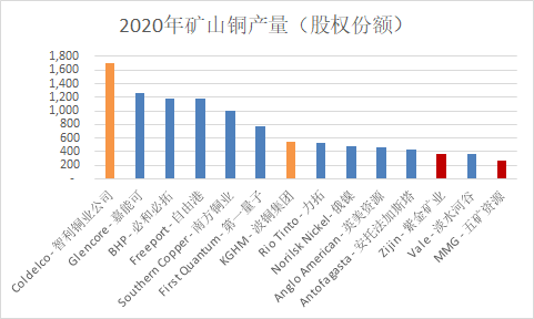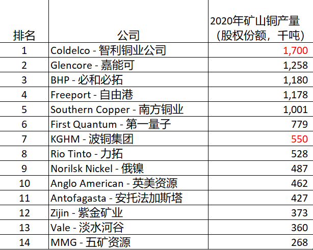 考拉已经连续四年发布全球十大铜矿公司。2020年全球十大铜矿公司(以股权份额合计计算产量)排名及产量预计如下: