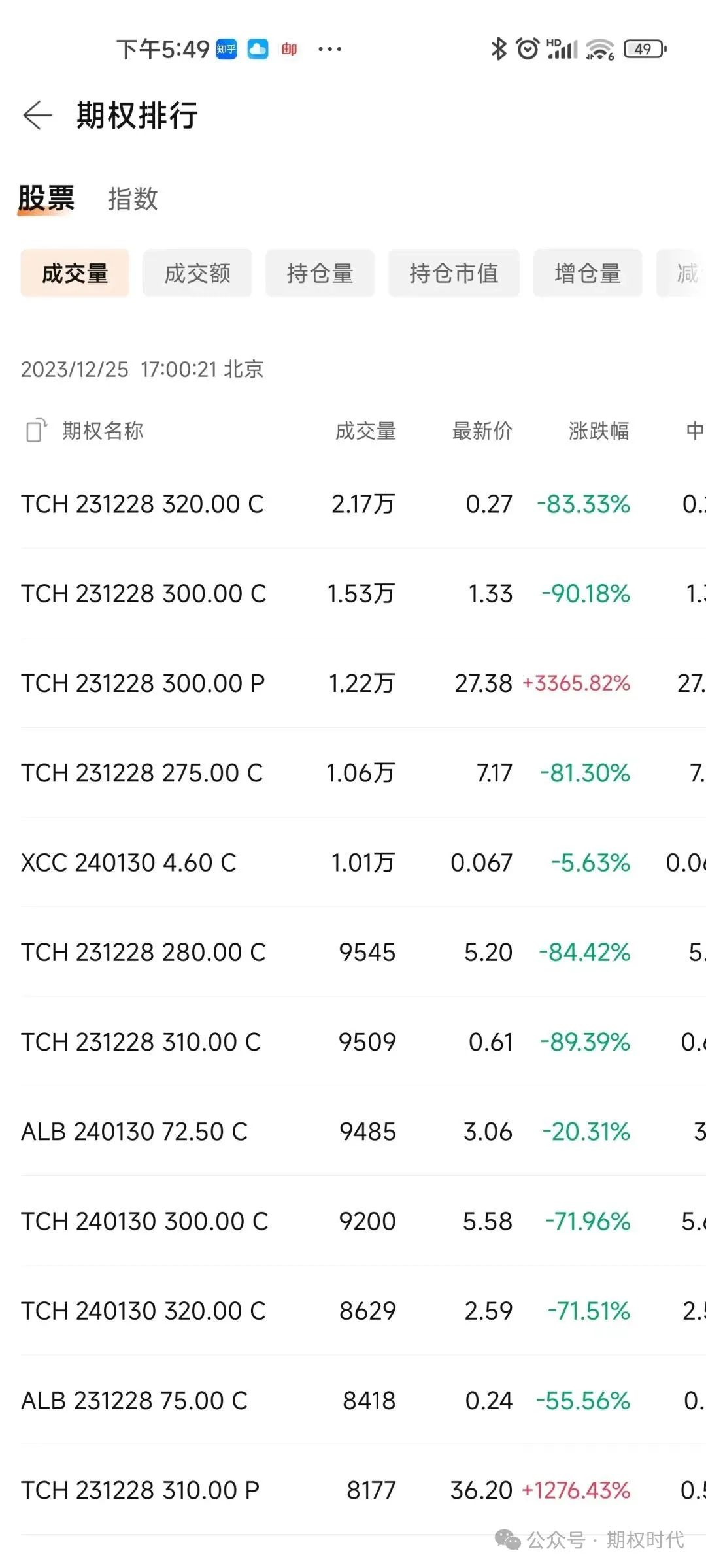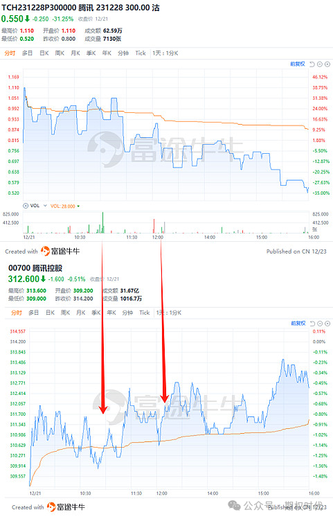 而从11月6日起,腾讯控股股价一直在300港元以上,故“TCH 231228 300.00 P”前几日成交量一直未放大。