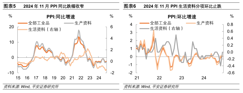 PPI同比跌幅收窄,环比由降转升,得益于生活资料价格回稳。11月PPI同比-2.5%,跌幅收窄0.4个百分点;PPI环比0.1%,由跌转涨。其中,生产资料PPI环比增长0.1%,持平于上月;而生活资料PPI环比由上月的回落0.4%转为持平,尤其是耐用消费品价格反弹,或受到“以旧换新”政策和“双十一”促销节奏的影响。分行业看:1)外需定价的石油化工拖累减弱,对PPI环比的拖累较上月减弱0.17个百分点。国际油价低位震荡,石油化工相关制品价格跌幅也同步收窄。2)中下游制造业对PPI的拖累减弱,装备制造和消费制造板块对PPI的拖累合计较上月收窄0.17个百分点。3)水电燃气价格由跌转涨,对PPI增速略有支撑。因北方大面积供暖开始,电力、燃气需求季节性增加。4)不过,黑色建材和有色金属价格涨幅收窄,对PPI的环比支撑减弱,部分商品前期较快反弹后涨势放缓。