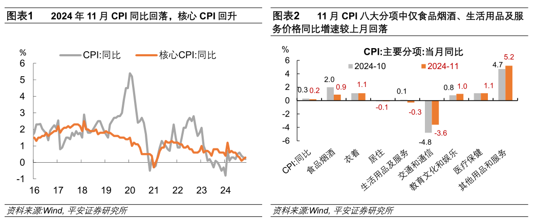 2024年11月CPI同比增长0.2%,较上月回落0.1个百分点。其中,CPI食品分项同比增速回落1.9个百分点至1.0%,非食品价格同比增速由上月的下降0.3%转为同比持平;剔除食品和能源的核心CPI同比增速微升0.1个百分点至0.3%,连续两个月回升。从环比增速看,11月CPI下降0.6%,弱于季节性表现(2014-2023年同期均值为-0.1%)。