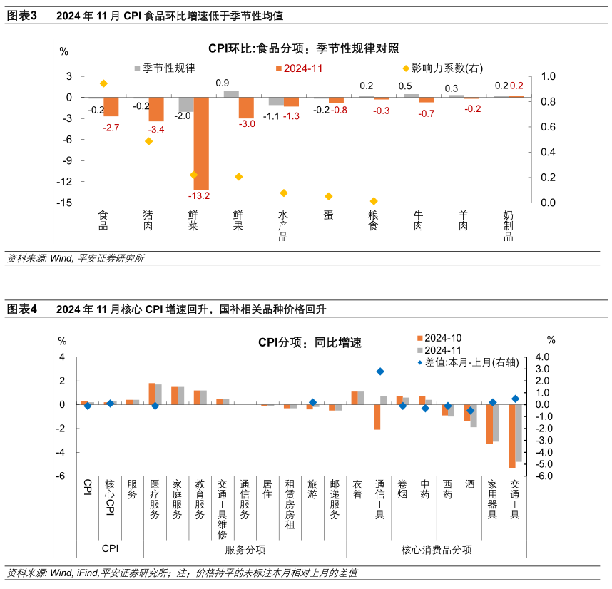 CPI同比增速小幅回落。11月CPI同比增长0.2%,较上月回落0.1个百分点;剔除食品和能源的核心CPI同比增长0.3%,较上月提升0.1个百分点。结构上:1)食品价格弱于季节性,是CPI的主要拖累。鲜菜、鲜果、猪肉、水产等价格超季节性下跌,暖冬天气下供应充足、储运便利,四者合计影响CPI环比下降约0.46个百分点,占CPI总降幅约八成。2)服务价格同比持平,继续支撑CPI表现。服务相关分项中,旅游价格跌幅收窄,淡季表现略强于去年同期;居住服务价格趋稳,受房地产销售回暖的支撑;除此之外,医疗服务价格微降,家庭服务、教育服务、交通工具维修、通信服务、邮递服务价格同比增速持平于上月。3)能源价格跌幅收窄。受国际油价变化影响,11月能源价格同比下降3.8%,降幅比上月收窄1.3个百分点。3)商品价格止跌,价格同比增速由上月下降0.2%转为持平。其中,通信工具价格由跌转涨,家用器具和通信工具价格跌幅收窄,三者均属于“以旧换新”补贴相关领域;而中药、西药、酒、卷烟等价格同比跌幅扩大。