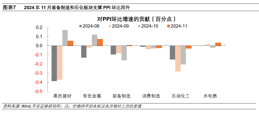 分行业看,11月份石油化工和装备制造板块价格“止跌”,助力PPI环比增速回升,而前期偏强的黑色建材和有色金属价格涨幅收窄。将细分行业归为:黑色建材、有色金属、装备制造、消费制造、石油化工、水电燃气六个大类,据此测算11月PPI增速的环比支撑在于: