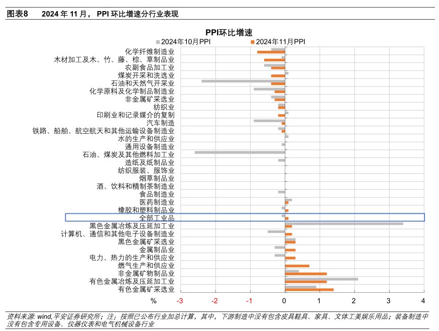 从环比看:11月PPI环比0.1%,由上月的跌0.1%转为上涨。其中,1)生产资料PPI环比增长0.1%,影响PPI总水平上涨约0.10个百分点。生产资料中,采掘和原材料工业价格环比增速提升,但加工工业价格环比涨幅收窄。2)生活资料PPI环比持平,上月为回落0.4%。生活资料中,一般日用品价格涨幅收窄,衣着价格环比持平,食品价格跌幅略有收窄;耐用消费品价格反弹,环比由上月的下降1.1%转为上涨0.2%,或受到“以旧换新”政策和“双十一”促销节奏的影响。