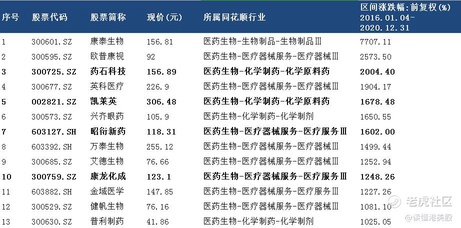 此外,在医药生物涨幅排行榜中还有两家规模较小,但在某一细分领域有核心技术的企业,药石科技和昭衍新药,它们也获得了十倍的增长。