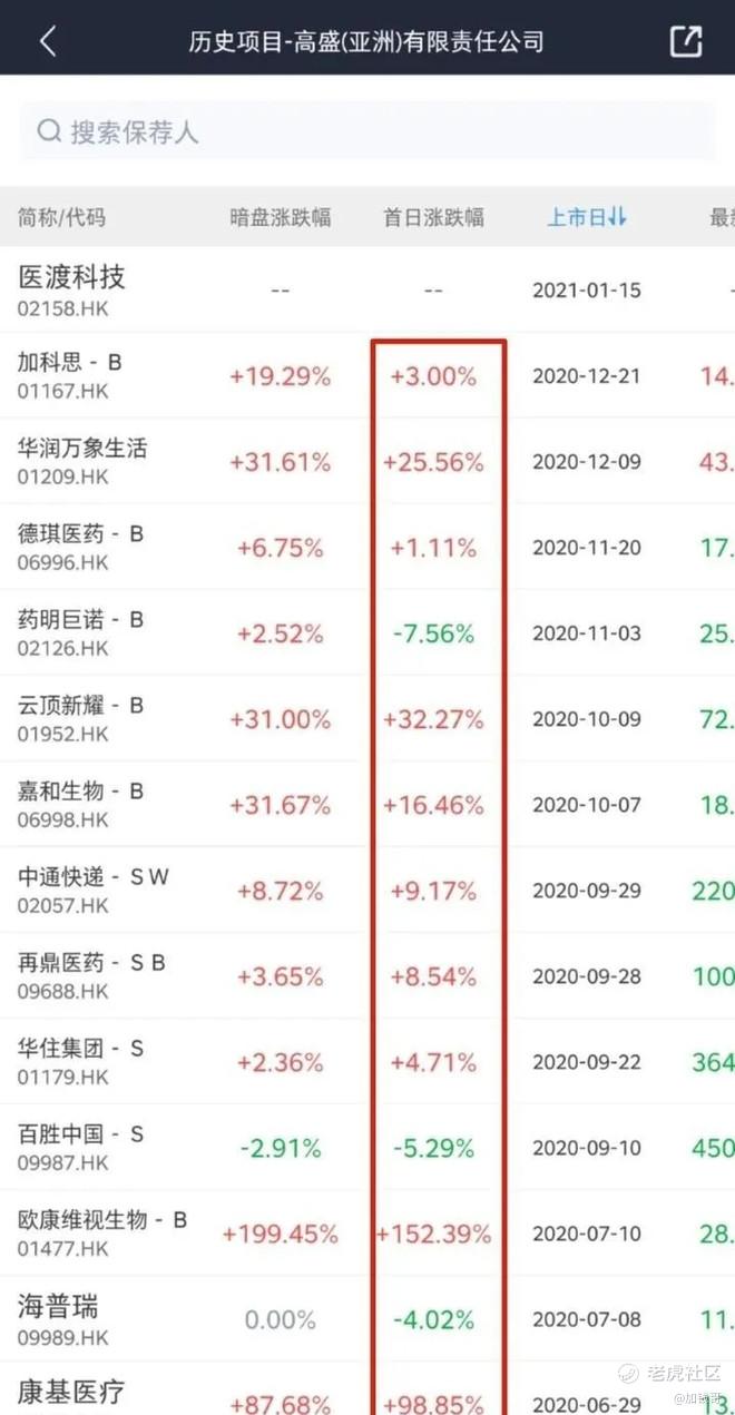 例如,我们点击高盛(亚洲)有限责任公司,可以看到它近期保荐的公司首日上涨情况。我们可以看到,这家保荐人的业绩是不错的,整体首日上涨的概率是很高的。