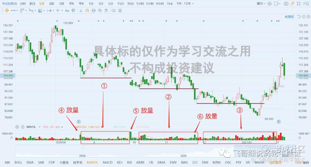 那么在箭头②的红色框内的成交量,和箭头①差不多的水平,股价也是有着支撑,同样的套路在于箭头⑥,一根放量下跌的大阴线,跌破支撑位了就无需再过于关注。