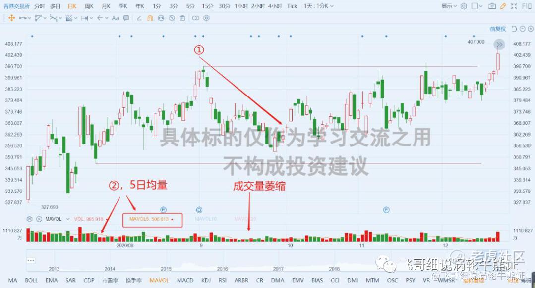 下图我以港交所为例子,来进一步的剖析价格和成交量的关系。