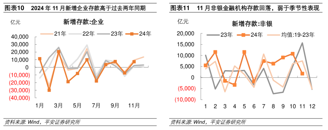 第二,M2同比增速回落,受贷款增速回落、股票市场波动的影响。2024年11月M2同比增速回落0.4个百分点至7.1%,同期人民币贷款增速回落0.3个百分点。结合存款端分项看,与证券客户保证金相关的非银行业金融机构存款在8月到10月强劲增长,到11月份增量放缓,对M2增速的支撑减弱,或因居民投资股票市场的热度边际有所减弱。