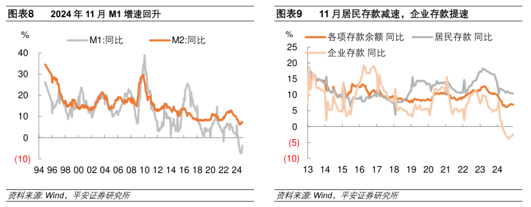 第一,M1同比增速回升,受房地产销售恢复、翘尾因素,以及地方政府债务偿还的支撑。2024年11月M1同比增速回升2.4个百分点至-3.7%。房地产销售恢复能够使居民存款向企业存款转移,体现为11月份居民存款的减速和企业存款的提速。翘尾因素方面,去年同期M1同比增速表现偏弱,11月份较10月回落0.6个百分点。地方政府化债资金到位后,部分用于偿还前期拖欠的企业账款,也有助于提升M1增速。