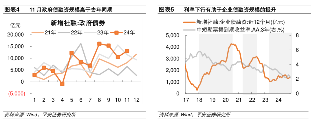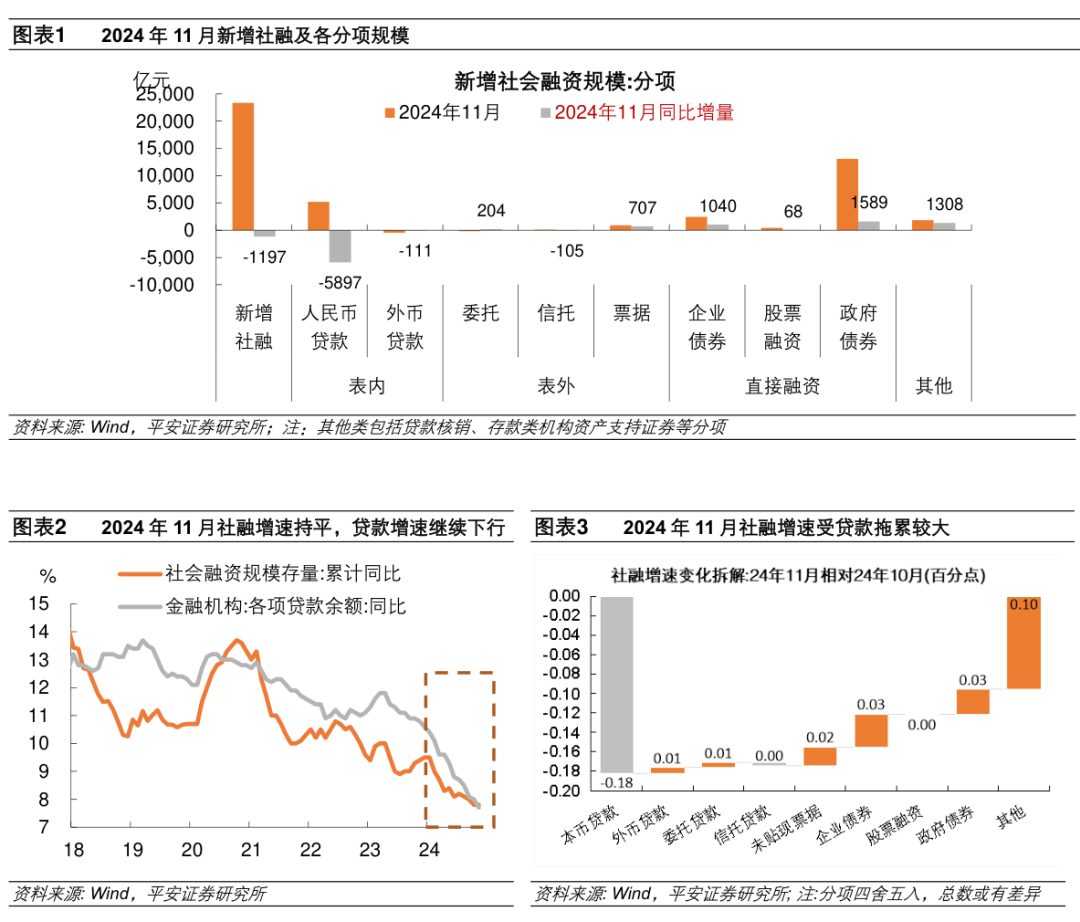 1. 社融增速持平。11月新增社融约2.3万亿,社融存量同比增速持平于7.8%。其中:1)地方政府债务化解使社融政府债与贷款“此消彼长”。2024年11月政府债券同比多增,拉动社融同比增速0.03个百分点;而社融口径人民币贷款同比少增,拖累社融同比增速0.18个百分点。地方政府发行置换债券积极性较高,使得政府债净融资在去年高基数基础上进一步多增。为避免“两头付息”,地方政府可能选择提前偿还贷款,一定程度上拖累人民币贷款表现。2)企业债券融资对社融增长形成支撑,同比多增1000多亿元,拉动社融同比增速0.03个百分点。得益于市场利率的较快下行,企业债券融资积极性较高,相比2023年同期出现修复。3)未公布的其他分项(包括存款类金融机构资产支持证券、贷款核销等)对社融增速的拉动或有进一步提升。11月全国金融机构改革化险处置不良资产规模近5000亿元,贷款核减会导致当月各项贷款余额存量减少。