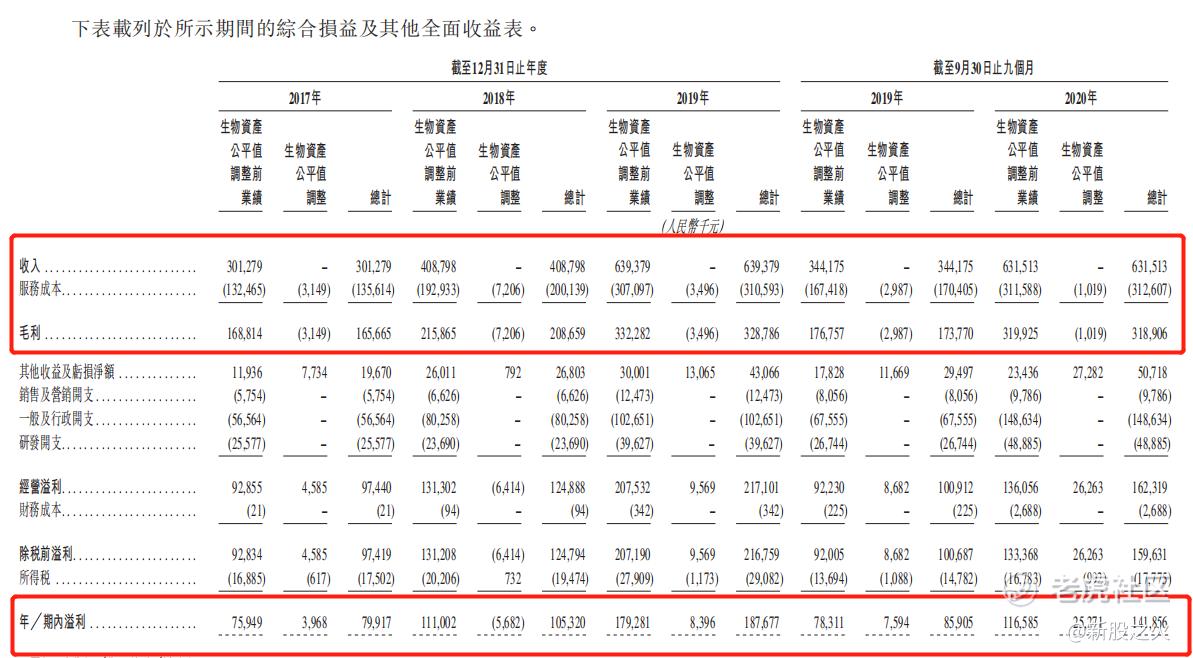 根据招股书显示,收入主要来源于:(1)非临床研究服务;(2)临床试验及相关服务;(3)销售实验模型,其中第(1)是最主要的收入来源。2017年至2019年度的收入(人民币)分别为3.01亿、4.09亿和6.39亿,复合增长率45.7%,毛利率保持在50%以上,相应的利润分别为0.8亿、1.05亿和1.88亿,复合增长率为53.3%。按照招股价中位数计算,市值61.52亿(H股),市盈率183。