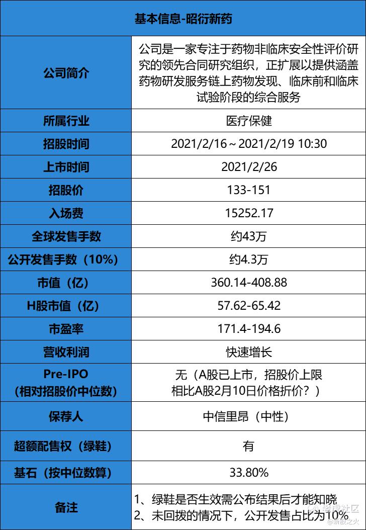 昭衍新药于2017年在A股上市,目前股价为161.35元(2021年2月10日收盘价),本次香港招股价上限为151元,相比A股折价约21%,与去年在香港上市的泰格医药基本类似(19%),给上市后预留的空间并不大,但也具有一定的安全垫,只要认购成本不要过高就还不错。除此之外,我们也要注意到,A股昭衍新药年初股价约100元,但到目前不足1个半月时间,股价相比年初已经上涨超60%,从而也变相地提高了港股昭衍新药的定价。