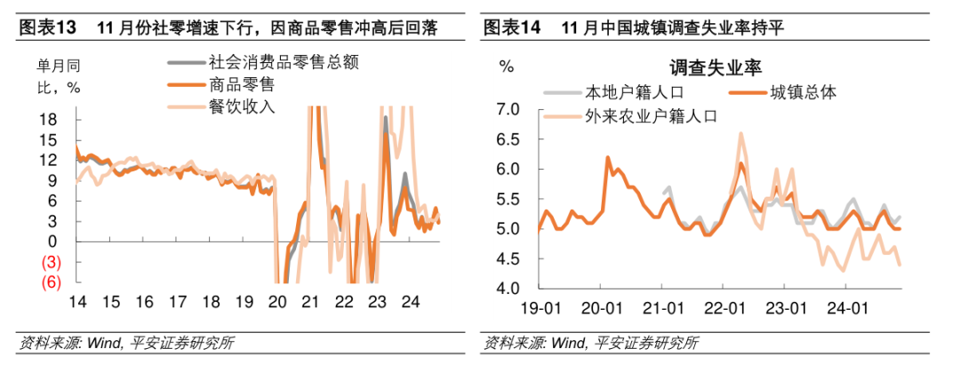 需理性看待主要经济数据的月度波动。一是,我们估算[1],2024年11月中国月度GDP增速达到5.5%,虽较10月回落0.1个百分点,但仍处下半年以来次高点,高于全年“5%左右”的GDP增速目标。二是,四季度以来经济增速明显高于三季度。国家统计局新闻发布会表示,如果将10月和11月合并来看,规模以上工业增加值、服务业生产指数、社会消费品零售总额增速分别比三季度加快0.4、1.4和1.2个百分点。三是,12月中国经济的持续恢复仍有支撑。除却前期增量政策,预计12月中国经济还将受到“抢出口”效应、2025年春节较早备货提前、暖冬天气有利施工等多重因素带动。
