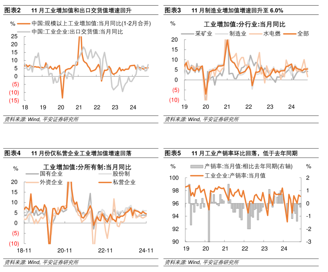 2. 工业生产增速回升。11月工业增加值同比增长5.5%,增速比上月加快0.1个百分点,处于2024年6月以来的最高水平。结构上:1)工业增加值的主要支撑在于装备制造业。11月制造业工业增加值增速提升0.4个百分点,其中装备制造业增加值同比增长7.6%,较上月提升1.0个百分点;采矿业和水电燃气行业增速回落。2)外需对工业生产的带动作用较强。11月份工业出**货值同比增长7.4%,比上月加快3.7个百分点,较工业增加值名义增速高4.4个百分点。3)工业产销率强于三季度。11月工业产销率环比上月回落0.2个百分点,相较去年同期低0.3个百分点,较三季度明显改善。4)私营企业是薄弱环节。11月份国有、股份制及外资企业工业增加值增速提升,而私营企业增速回落0.3个百分点至4.5%,弱于工业总体增速。