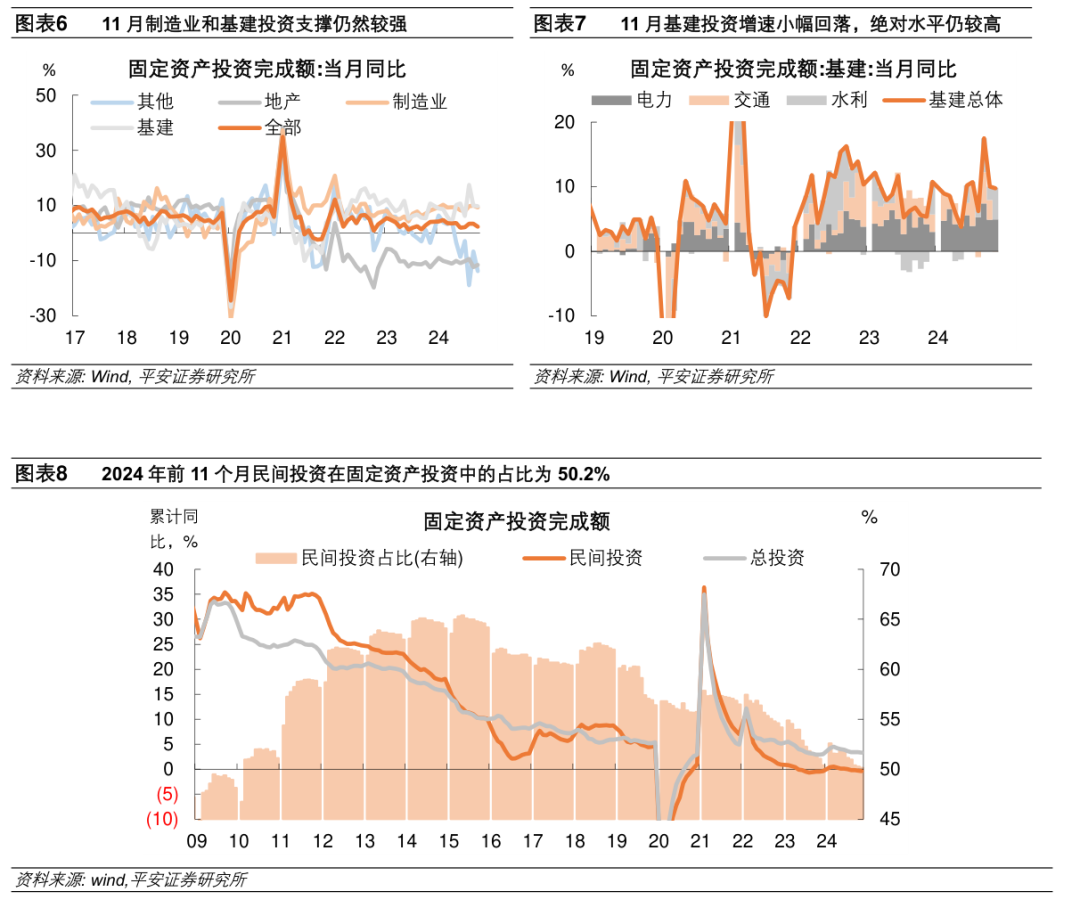 3. 基建和制造业投资支撑仍较强,尽管11月单月增速放缓,但增速水平高于全部投资,支撑作用明显。11月单月固定资产投资同比增长2.4%,较上月回落1个百分点。制造业投资单月同比增长9.3%,较上月回落0.7个百分点,仍受到设备购置投资的支撑。基建投资单月同比增长9.7%,主要支撑在于“两重”项目的推进,边际回落0.3个百分点。民间投资累计同比增速为-0.4%,较上月回落0.1个百分点。2024年前11个月,民间投资在固定资产投资中的占比为50.1%,比2023年年末低0.24个百分点。