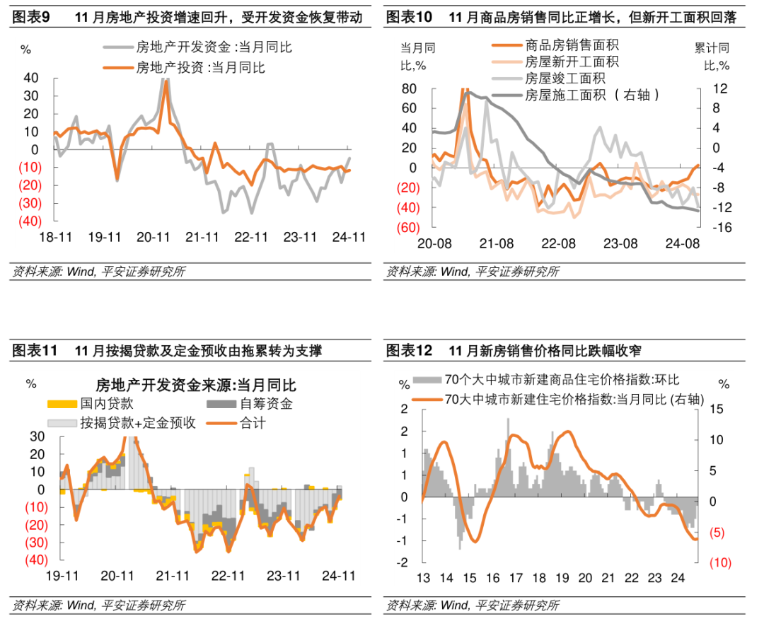 “930”新政以来,房地产市场积极信号增多,增量政策落地带动房地产销售、房价和开发资金同步回暖。11月商品房销售面积单月同比增长2.6%,系2023年5月以来首次正增长。从统计局公布的70个大中城市房价指数看,11月份新房价格环比跌幅收窄至-0.2%,同比跌幅收窄0.1个百分点至-6.1%。销售面积同比转正、新房价格同比跌幅收窄,以及房地产融资项目“白名单”推进,同步助力房企资金改善。11月单月,房地产开发企业本年到位资金同比增速为-4.9%,降幅较上月收窄5.8个百分点;其中,国内贷款单月同比降幅收窄5.1个百分点至-3.1%,与房地产销售关联较高的定金及预收款及个人按揭贷款同比增长4.3%,较上月降幅收窄9.6个百分点,为2023年6月以来首次正增长。