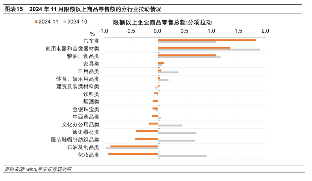 从限额以上商品数据看,涉及以旧换新政策的汽车、家具零售同比提速,对限额以上商品零售增速的拉动提速0.8个百分点;但以旧换新涉及的家电、通讯器材类、文化办公用品等零售额增速回落,对限额以上商品零售拉动合计减弱3.3个百分点;此外,不涉及以旧换新的化妆品类、服装鞋帽针纺织品类零售额同比由涨转跌,对限额以上商品零售的拉动分别较上月减弱1.8和1.1个百分点。