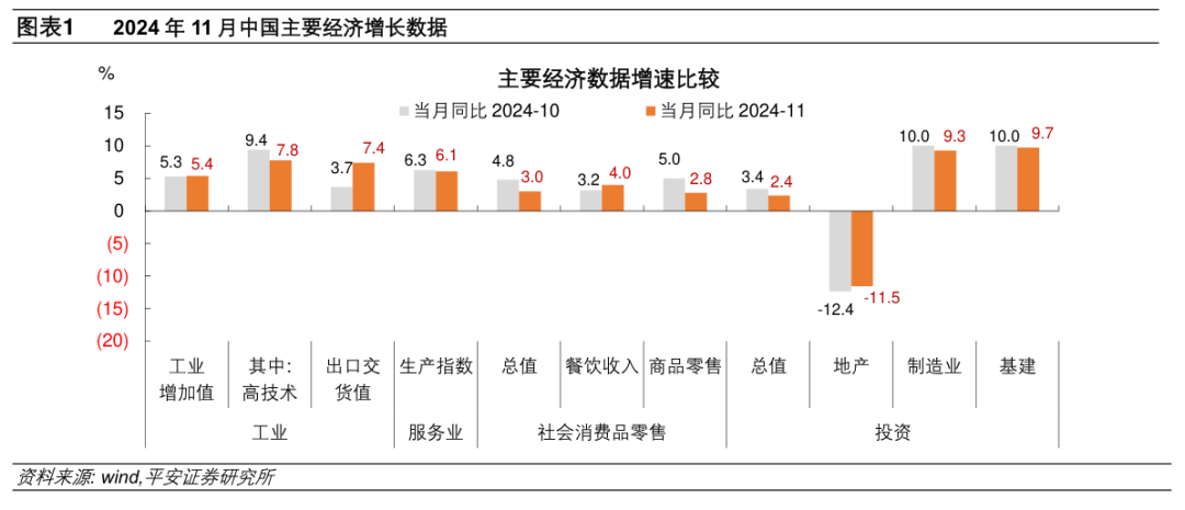 2024年11月,主要经济增长数据边际回落,生产端工业较快增长,而服务业增速放缓,需求端消费和投资边际走弱。在生产端,11月服务业生产指数同比增长6.1%,较上月回落0.2个百分点,为年内次高点;工业增加值同比增长5.4%,较上月提升0.1个百分点,重回6月以来高点。在需求端,出**货值增速提升,但社会消费品零售总额和固定资产投资增速回落,其中制造业和基建投资支撑有所减弱。环比方面,国家统计局发布的11月工业增加值、固定资产投资、社会消费品零售总额的季调环比数据年化分别增长5.7%、1.9%、1.2%,保持增势。