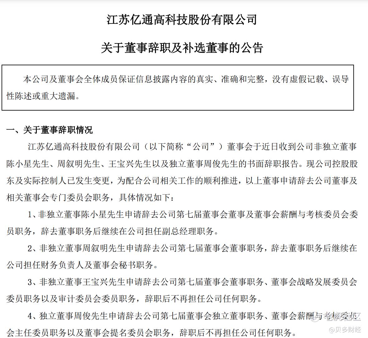 2月9日,亿通科技发布公告称,鉴于公司控股股东和实际控制人已发生变更,为积极配合公司相关工作的顺利推进,其非独立董事陈小星、周叙明、王宝兴以及独立董事周俊提交书面辞职报告。