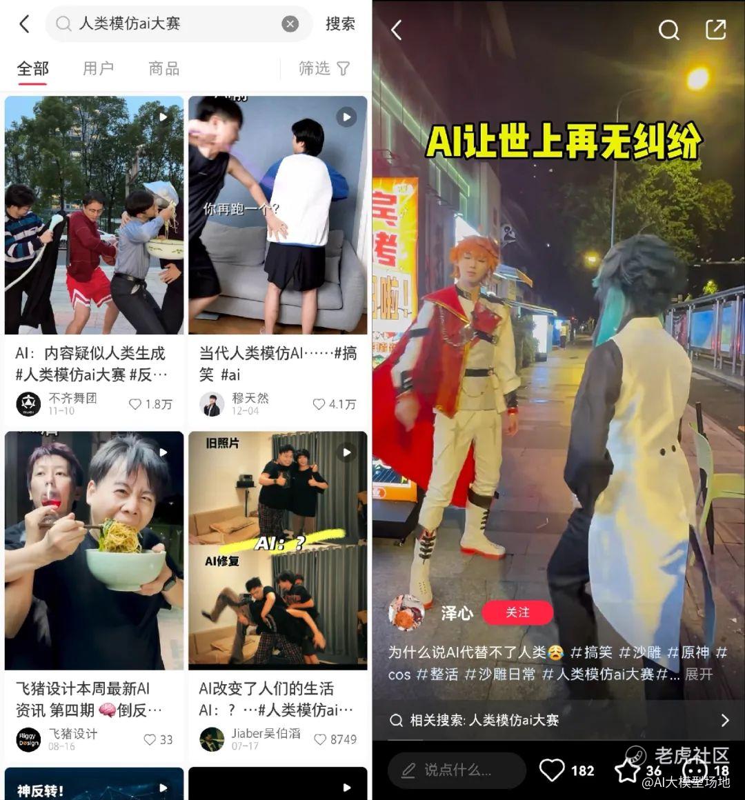 用小红书、B站等流媒体软件搜索“AI超越人类”关键词,就能发现一系列真人模仿AI生成效果的视频。它们出现在流媒体上的唯一原因,就是因为AI生成视频的效果跟真实世界差别过大,导致产生了过于搞笑的节目效果。