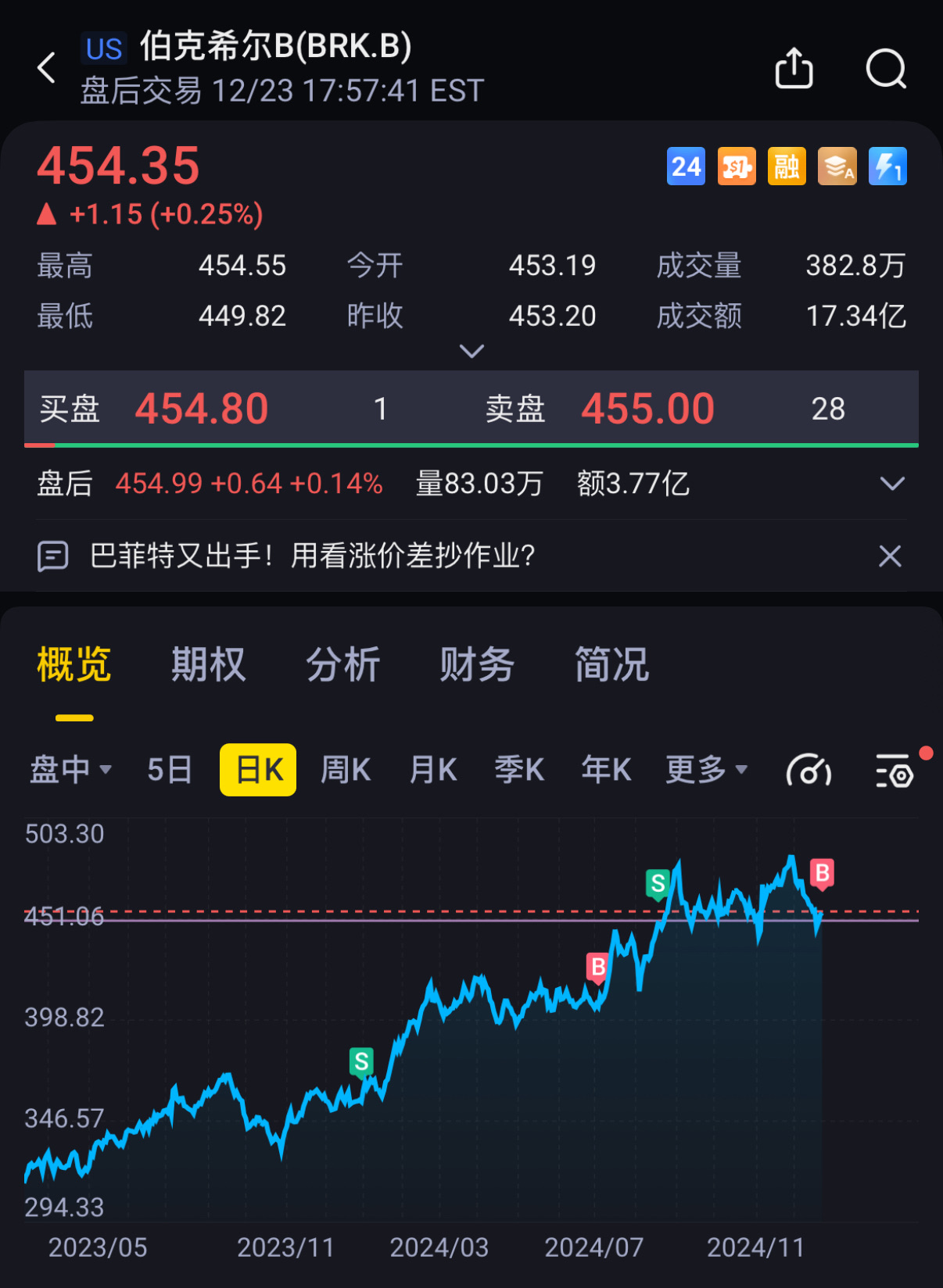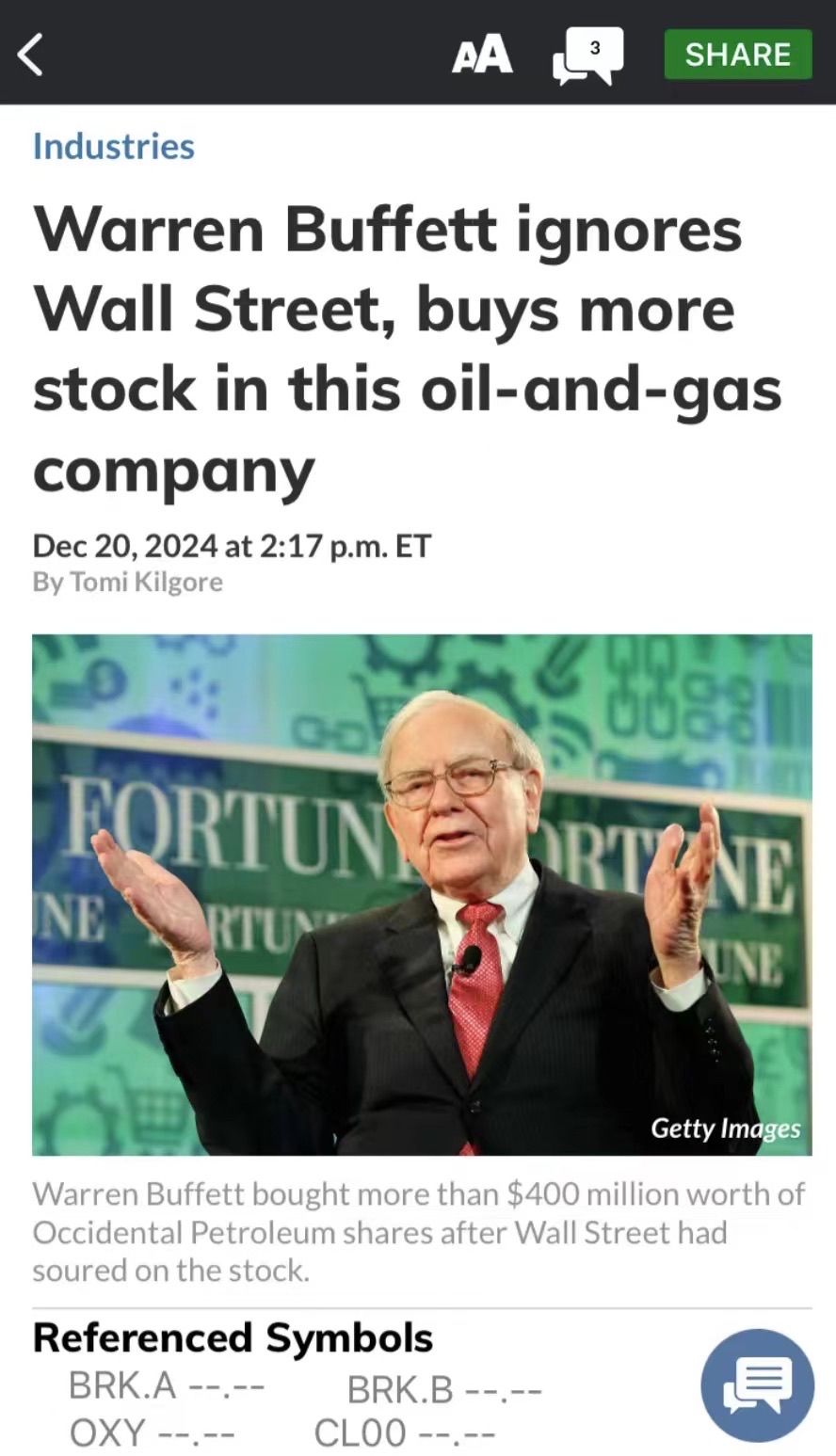 自今年8月450清仓BRK后 一直在寻找买回时机 这次巴老对OXY出手 我果断提高了建仓点位 重新买回![得意] 看起来虽然价格相同 但交易逻辑却完全不同了:卖掉是因为当时估值已经过高 提早落袋为安 而现在买入触底的BRK是则左侧交易 还有一个原因是亲石油的特朗普2.0 在25年上任后势必会赋予石油更多政治意义 那就代表有更多的市场热度 有热度就代表有波动 虽然报道上大肆渲染美联储放缓降息步伐 会造成市场经济不振 导致石油需求下降 但比起华尔街 我更相信特朗普[捂脸] 至少有巴老在兜底[嘘]