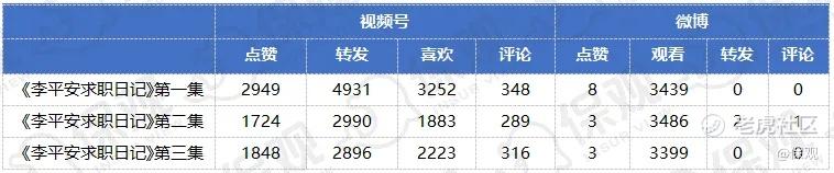 以平安发布的《李平安求职日记》为例,知微数据的统计显示,该短剧在视频号的总互动量达到2.5W;据保观统计,该短剧在微博平台的表现相对较平淡,播放量约为3000-4000左右,点赞、转发和评论只有个位数。