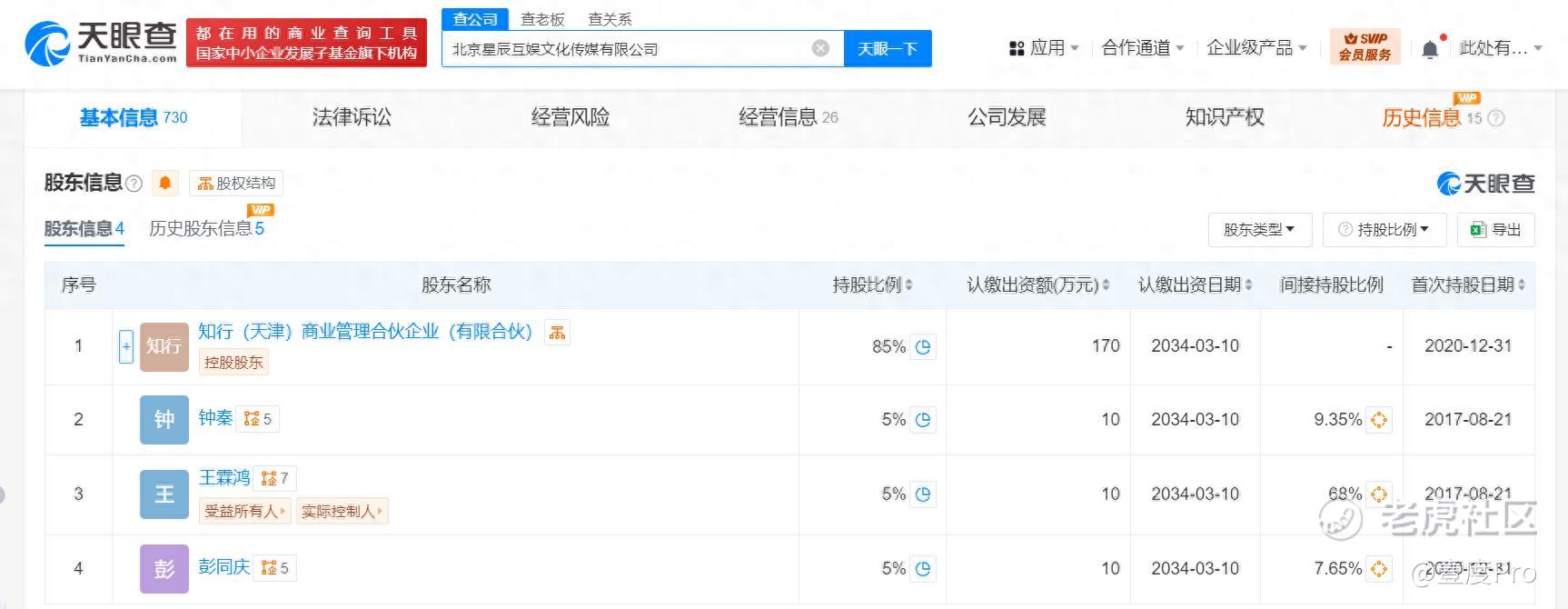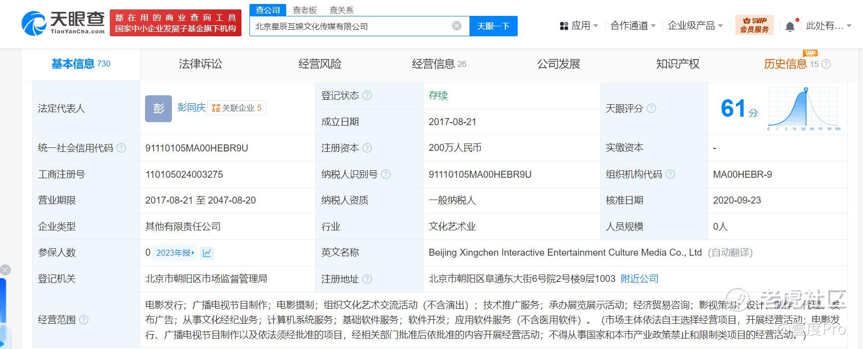 天眼查App显示,“星辰互娱传媒”关联公司北京星辰互娱文化传媒有限公司成立于2017年8月,注册资本200万人民币,法定代表人为彭某某,经营范围包括广播电视节目制作、从事文化经纪业务、组织文化艺术交流活动等,由知行(天津)商业管理合伙企业(有限合伙)及三位自然人共同持股。