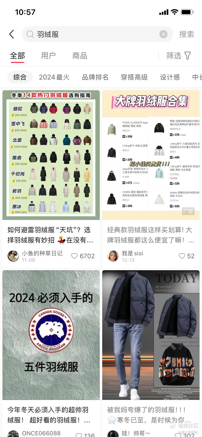 比如在小红书上搜索“羽绒服”,基本上是各种羽绒服的产品推荐,堪称“图文版”的什么值得买。小红书有1000字的发帖限制,虽然有利于降低分享的门槛,但是也不得不将一些有效信息删掉,所以并不适合原生内容这样的广告形式。这也是为什么在小红书平台上,广告的植入都很生硬,形式也比较单一的原因之一。