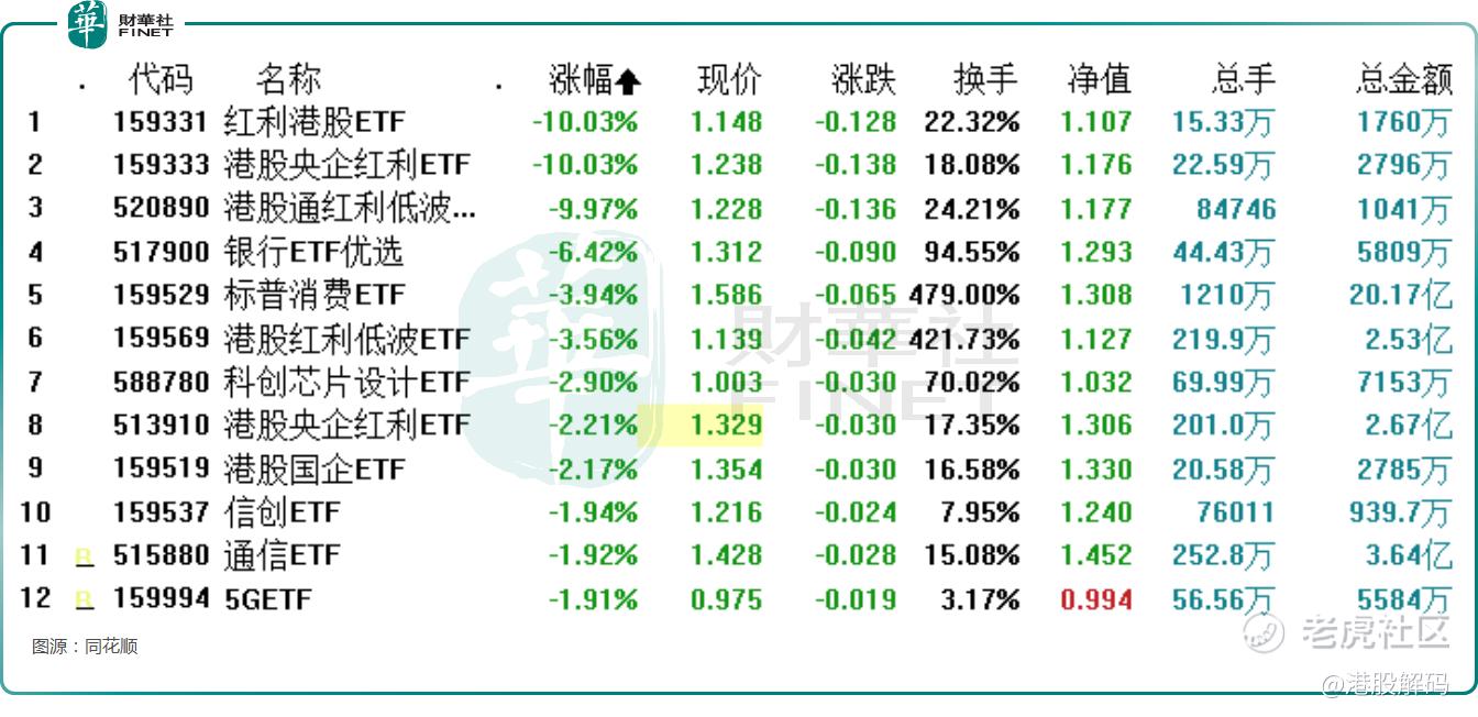 其中,港股通红利低波ETF(520890)、 $红利港股(159331)$ 放巨量涨停,港股 $红利央企(159333)$ 、港股红利低波ETF(159569)也放量上涨,重仓 $招商银行(03968)$ 、交通银行(03328.HK)、工商银行(01398.HK)、农业银行(01288.HK)、中国银行的银行ETF优选(517900)也出现放量上涨。