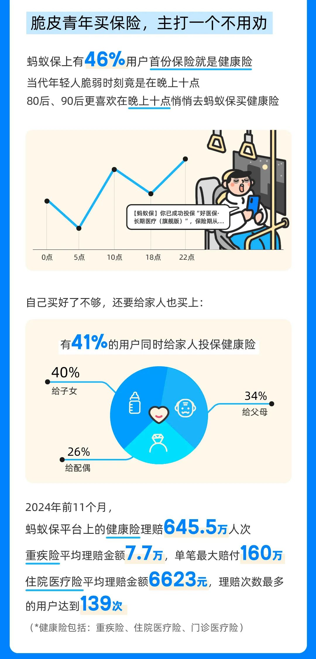 《2024保险服务年度趋势观察》(以下简称《年度观察》)显示,蚂蚁保平台上46%的用户购买的第一份保险是健康险,而且这些保民98%的人都有医保,“医保+健康险”正在成为越来越多人的基本保障配置。而且,有个非常有意思的点是,每天晚上10点钟,是80后、90后投保健康险的高峰。想想也是,忙碌完一天的工作和生活琐事,睡前的这一小段时间才完全属于自己,仔细研究下保险条款,看看哪款更适合。