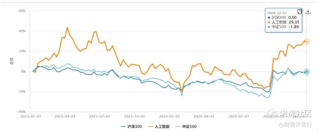 根据Wind数据,截至12月27日,2023年以来,中证人工智能产业指数累计回报为29.35%,走势明显强于沪深300(同期涨幅为0)和中证500(同期-1.89%)等宽基指数。