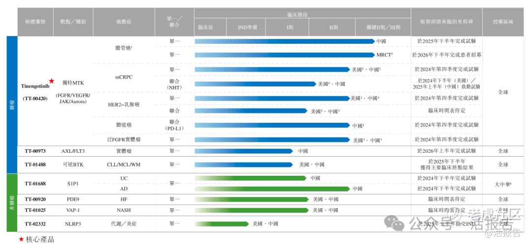 凭借本身全面融合的内部研发系统,公司已建立六款临床阶段候选产品及一款临床前阶段候选产品的管线。公司的核心产品Tinengotinib(TT-00420)是一款有潜力成为全球首创药物、处于注册阶段、自主研发的独特多靶点激酶(「MTK」)抑制剂(主要靶向三个关键通路(即FGFR/VEGFR、JAK和Aurora激酶))。