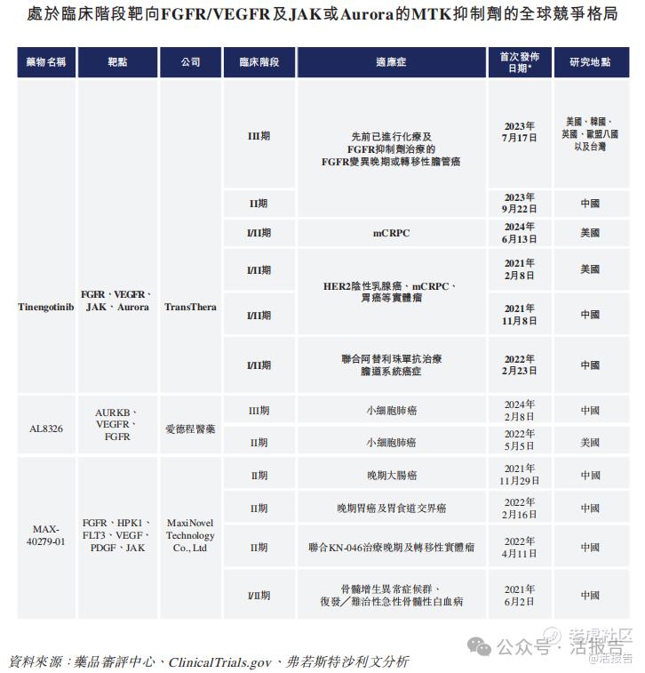 截至最后实际可行日期,一款靶向FGFR的MTK抑制剂(即厄达替尼)获得FDA批准。截至最后实际可行日期,全球有三款处于临床阶段的靶向FGFR以及JAK、Aurora及VEGFR中一种或以上的MTK抑制剂。Tinengotinib为一款独特的靶向FGFR/VEGFR、JAK及Aurora的MTK抑制剂,使其能有效治疗胆管癌、mCRPC及HR+/HER2-乳腺癌。