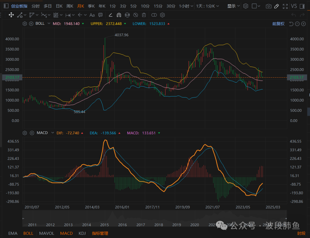 比如,上图的创业板指2010年到2024年就走了2.5轮牛熊: