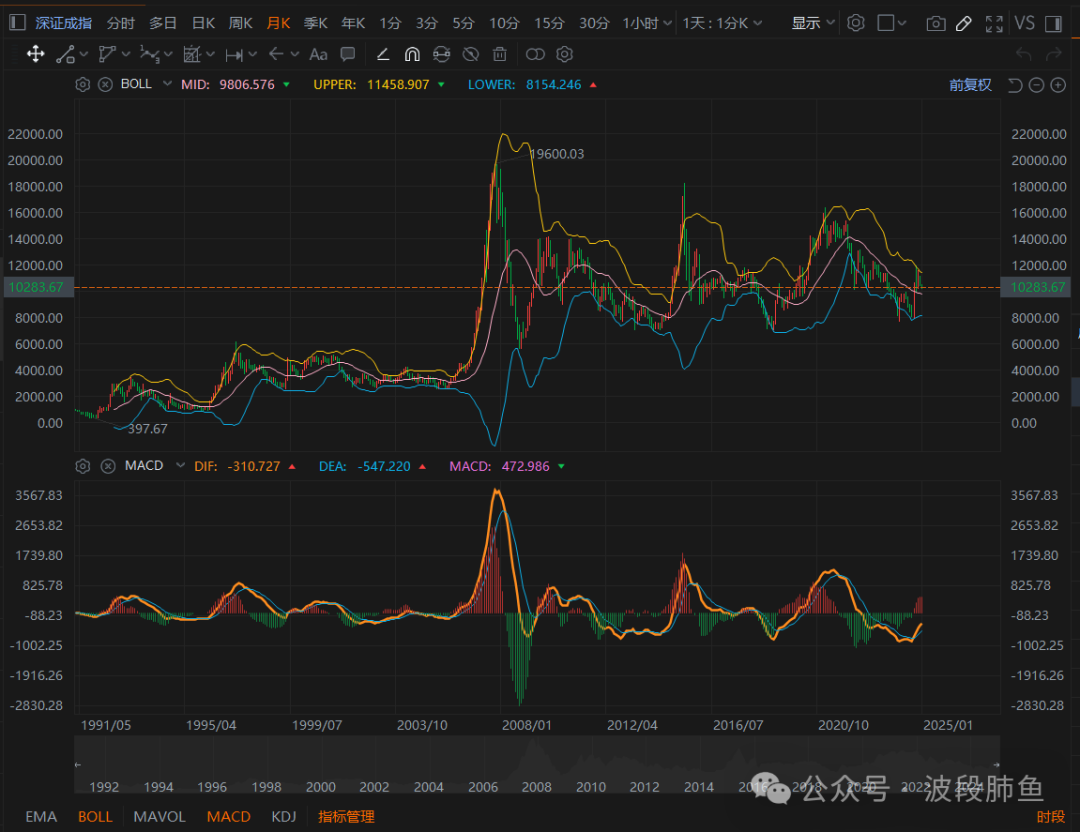 以深证成指为例(不同指数,有所不同),只看MACD月度指标即可一目了然预判牛熊。