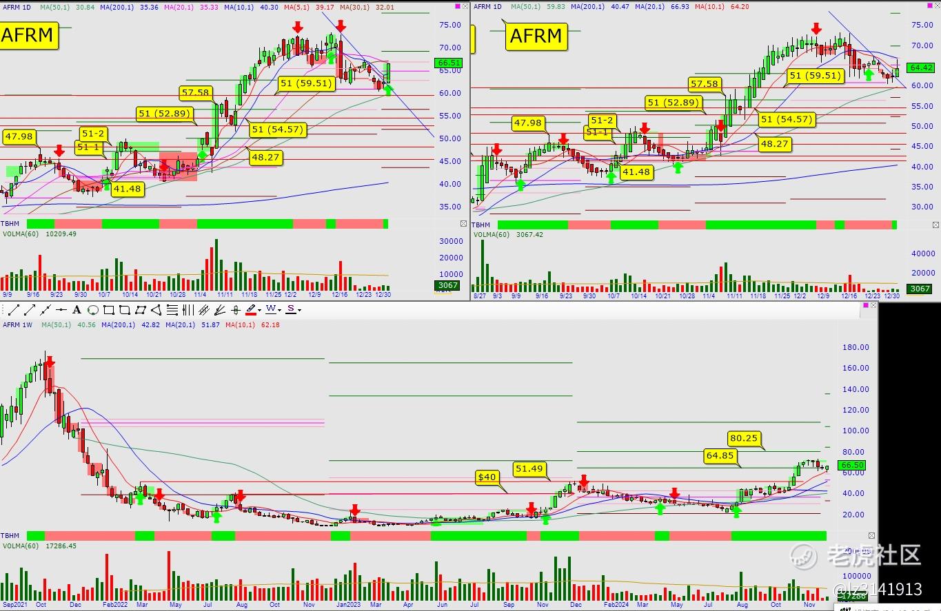 2. AFRM:老朋友,建仓5 %,日大趋势变绿,小趋势变绿,中轴线上,下一个目标80.25,最大止损5 %[玫瑰]