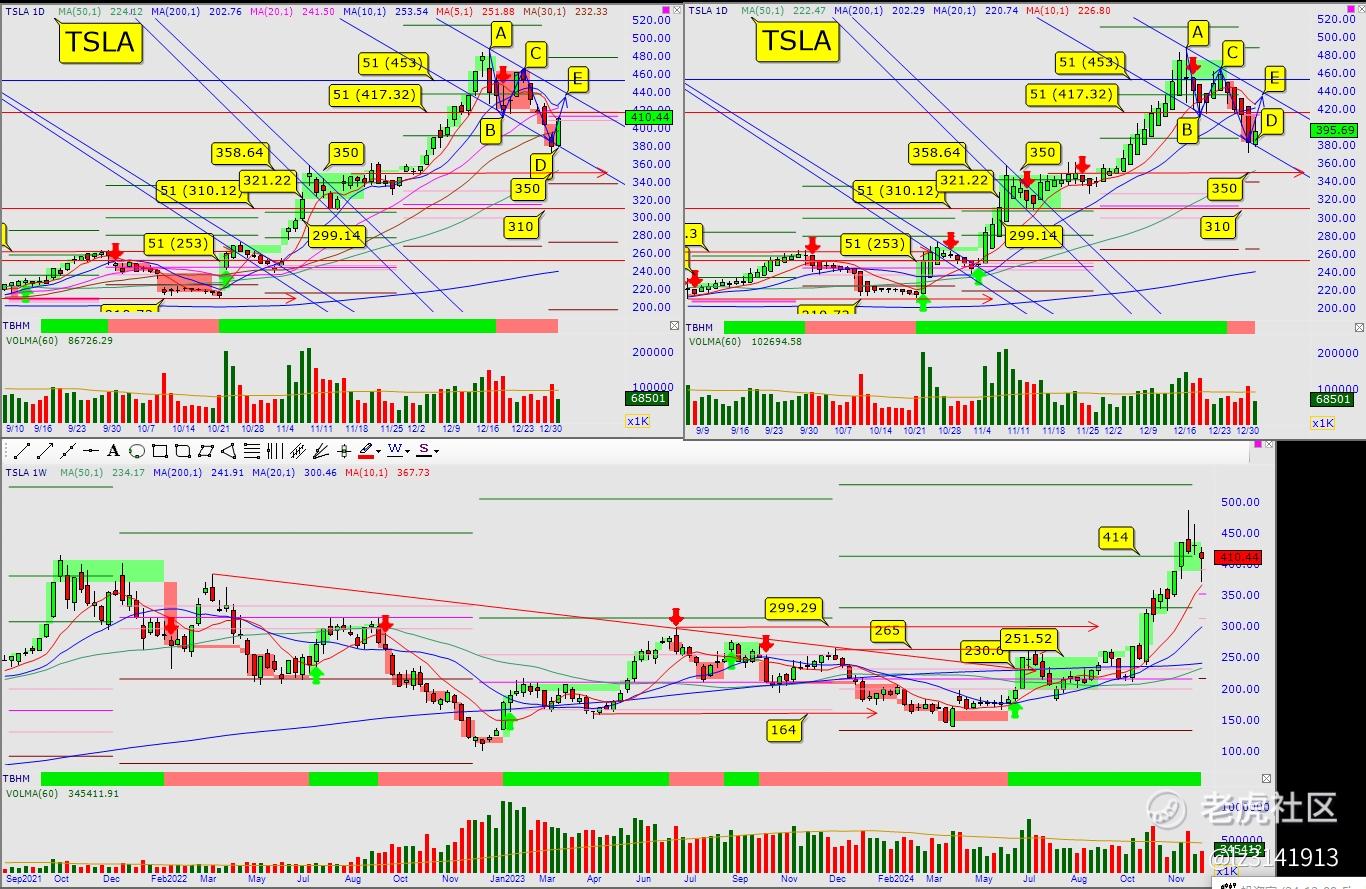 5. 特斯拉:在D点反弹,马上过中轴线,中轴线包容线很窄,日小趋势变绿大概率反弹到E点,如过E点反转,我今年特斯拉的第一目标价是500没变