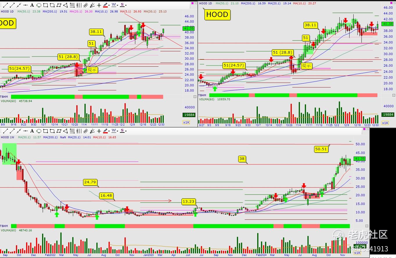 3. HOOD:老朋友,建仓5 %,趋势反转,日小趋势变绿,中轴线上,下一个目标50.51,最大止损5 %[玫瑰]